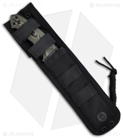 The EX-F01 knife is tough, with a 1/4″ thick A2 tool steel blade this tactical fixed blade isn’t the type to let you down. The 5.5″ KG Gun-Kote finished drop point blade is full tang with an extended breaker at the base. The shape and contour of the handle offers extreme comfort and grip with the index groove below and spine notches up top. The black G-10 handle scales feature a stylish “G-Mascus” pattern. Securely tucked on the front side of the handle is a Torx wrench so you can remove the scales, revealing a little storage inside. The EX-F01 includes a black Milspec ballistic nylon sheath with a MOLLE compatible back.
