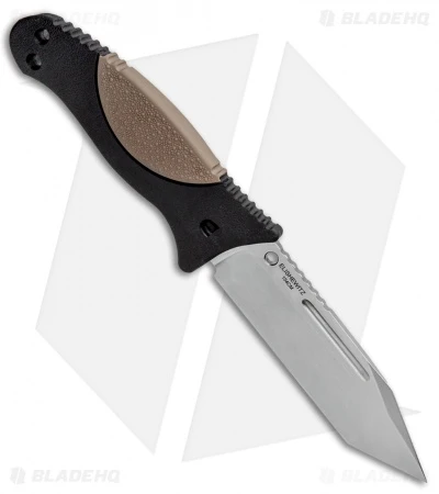 This EX-F02 model has a stonewashed tanto blade and a black handle with a Flat Dark Earth rubber overmold.