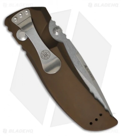 The 6061 T6 aluminum handle is anodized olive green. The drop point style 154-CM stone-wash finished blade (plain) is razor sharp. The blade comes out with a refined smoothness and locks securely into place via the button lock mechanism. There is also a front mounted safety to lock the blade open even more securely. For easy carry there is also reversible pocket clip.