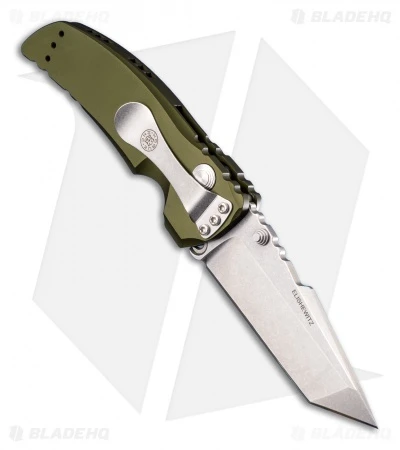 The 6061 T6 aluminum handle is anodized olive green. The tanto style 154-CM stone-wash finished blade (plain) is razor sharp. The blade comes out with a refined smoothness and locks securley into place via the button lock mechanism. There is also a front mounted safety to lock the blade open even more securely. For easy carry there is also reversible pocket clip.